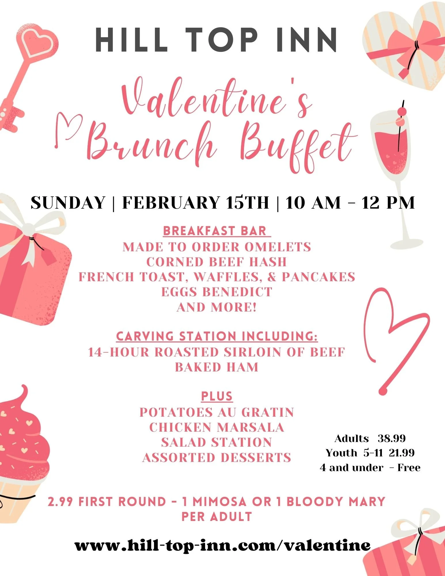 Feb 15 10:00 AM10:00 Valentine's Brunch Buffet Sunday, February 15, 2026 10:00 AM 12:00 PM 10:00 12:00 Hill Top Inn (map) Google Calendar ICS View Event →